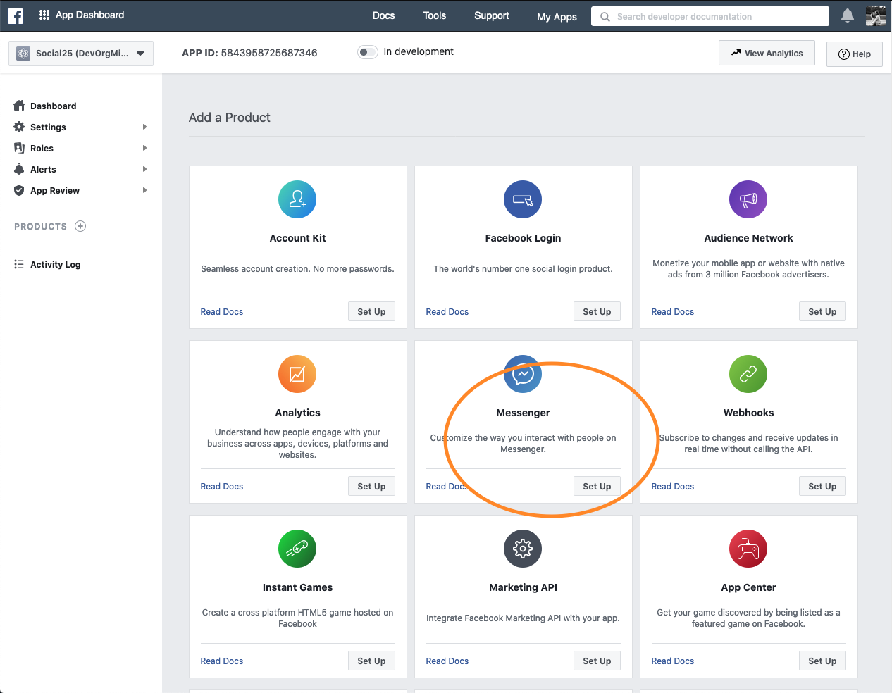 Search for the product called "Messenger" and click on "Set Up". (If you have already added the product navigate to the Settings page of the Messenger product.)