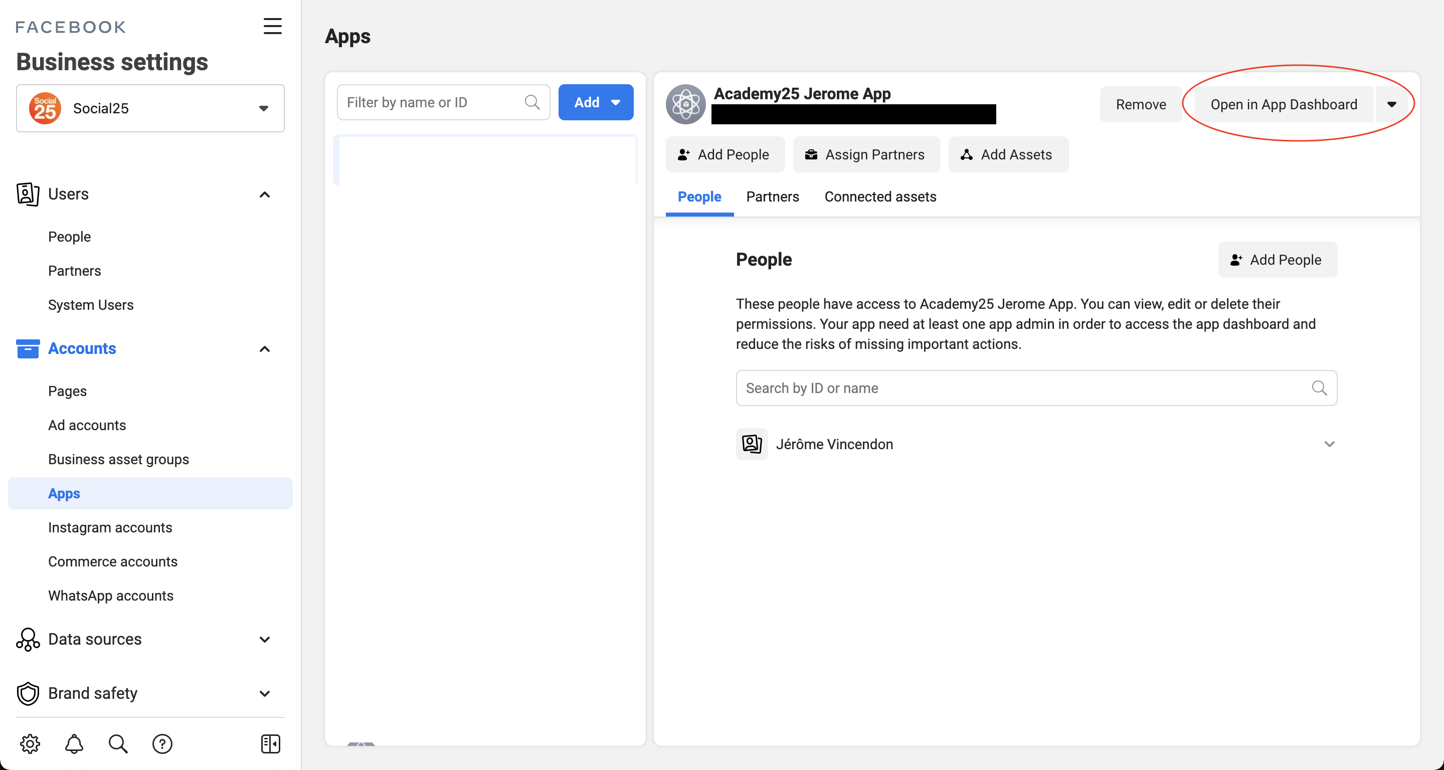 From Facebook Business Settings, go to your App Dashboard