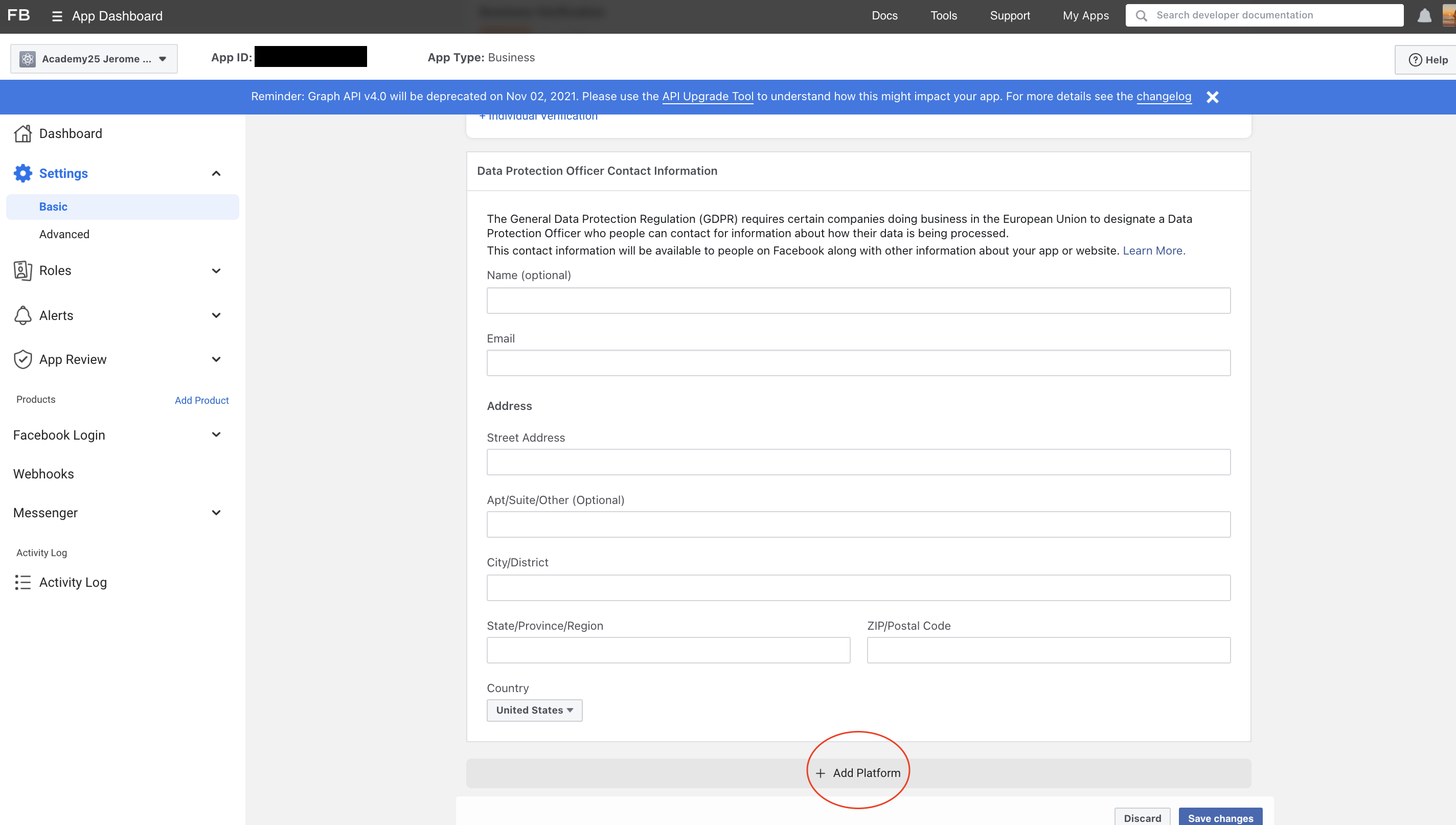 Scroll down to where you see the button "Add Platform"