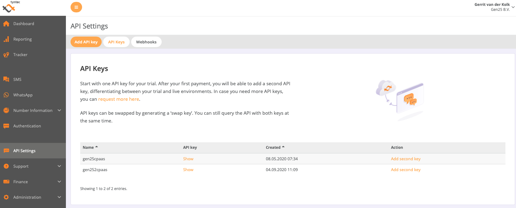 Navigate to the following page: https://my.tyntec.com/api-settings