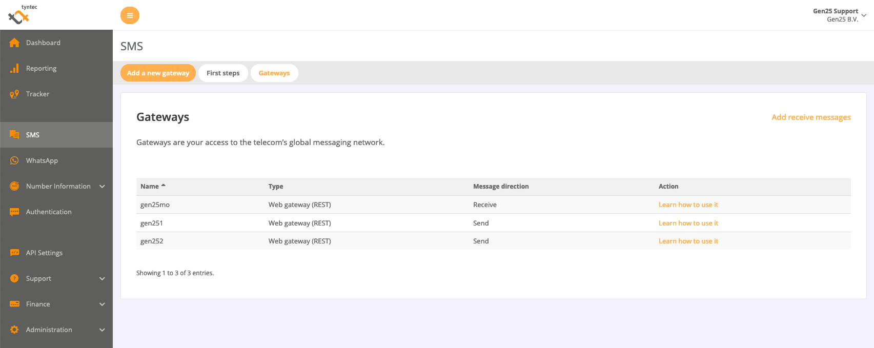 During your account creation with Tyntec, you have specified which phone number(s) you want to use for which countries. If you navigate to the SMS page (https://my.tyntec.com/products/sms) you should see a Receive and Send message direction gateway.