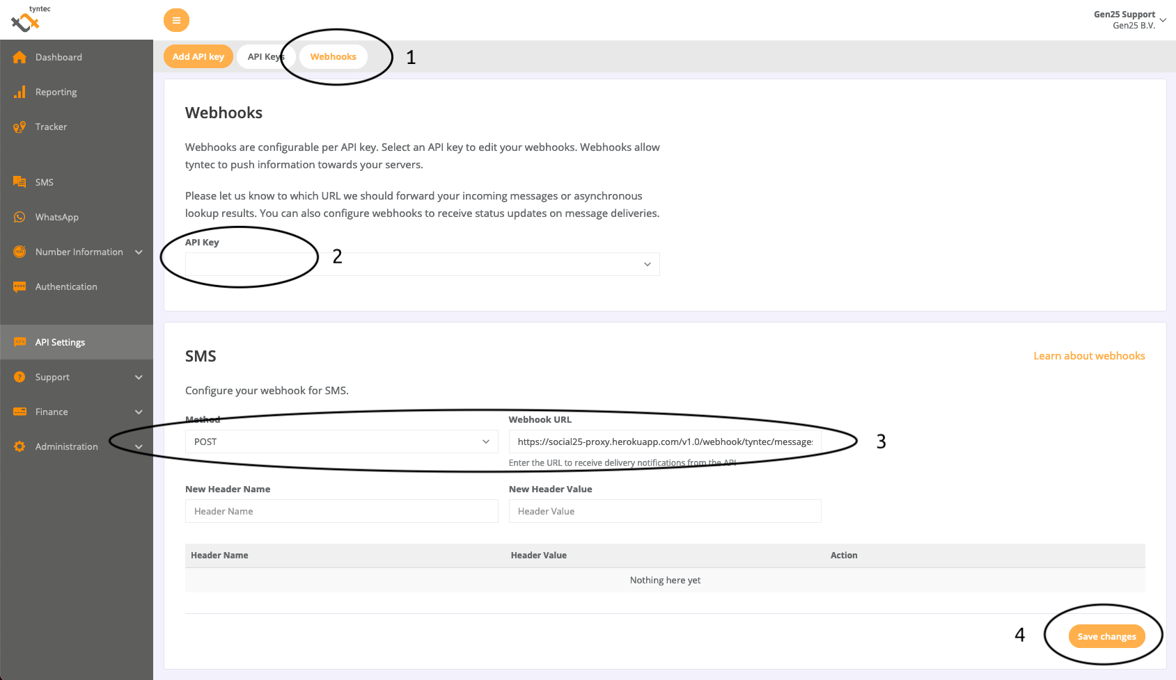 To make sure that inbound SMS messages arrive with GoTallo and in Salesforce as well we need to configure a webhook. This can be done via the API settings page (https://my.tyntec.com/api-settings).