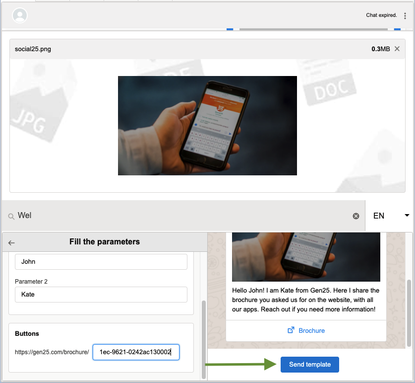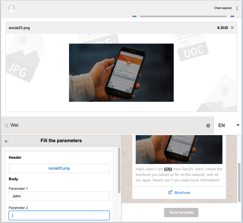 Once a chat has expired, the chat window will display relevant HSM template messages. Agents can select a template, and if required fill in the parameters. Agents will only be able to send the template after the parameters have been filled in.