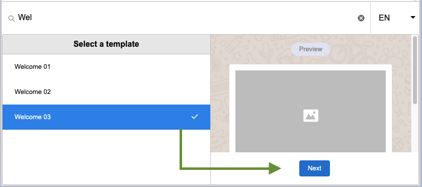 Select message template to preview and press “Next” to edit the template’s parameters: