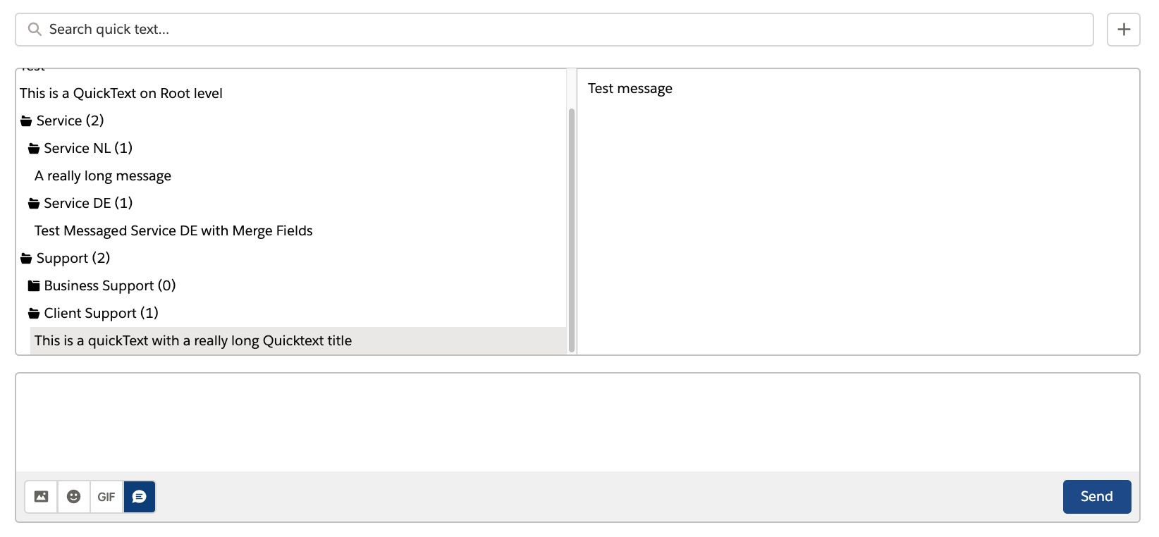 We’ve implemented a folder structure, through which you can navigate to find specific Quick Text. You can do this manually or with key shortcut 'CMD .' (so type Command and a .) within the text are of the chat component. You can now navigate through the Quick Text with arrows and open a folder with the 'Right arrow' key. Insert a text with 'Enter' or by clicking it.