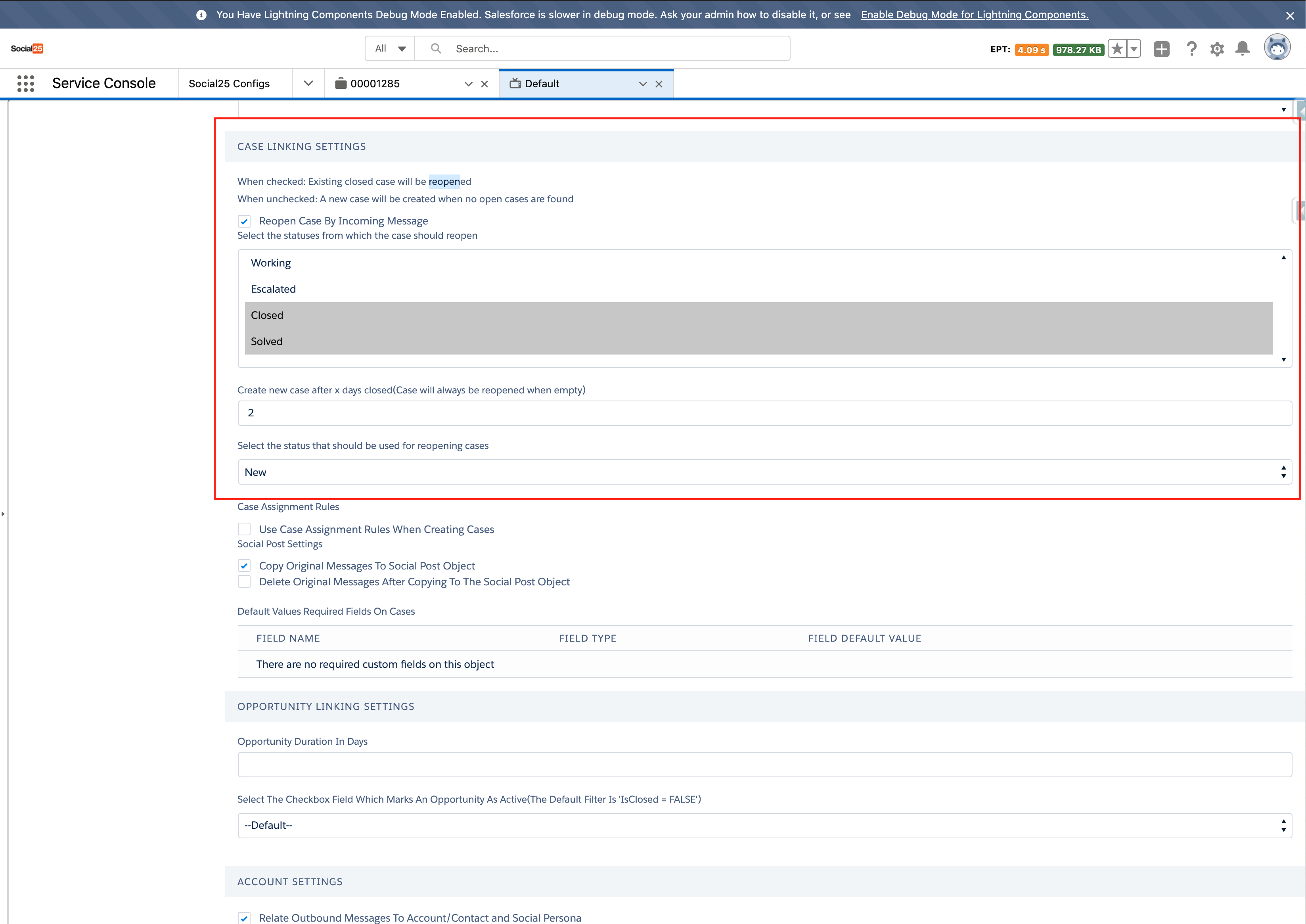Social25 allows you to configure that cases with a specific status should be set to a predefined status, when a new message comes in within a specified time frame. You can use this to re-open closed cases when a customer sends a new message within 24 hours for example. For the purpose of this article, we will call this functionality ‘re-opening cases’.