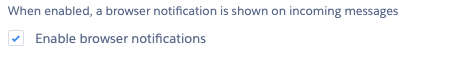 When enabled, this allows active chats (which are open in a Salesforce Tab) to be monitored for incoming chat messages. When a chat message is received, you will receive a generic notification in your browser that informs you that a new message has been received.