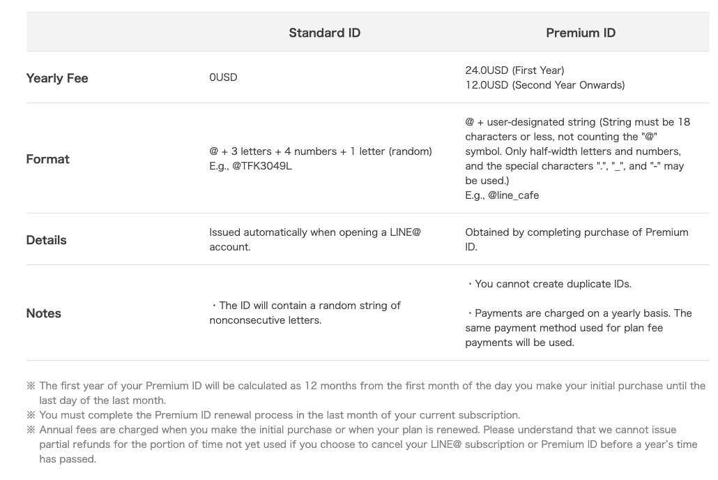 When you create you free unverified Line Official Account you'll be given a random string for your Line ID. The Line ID is the unique identifier for your account. A free Line ID will look something like @anfr321.The Premium ID is an option that allows you to personalize your Line ID for a price. You can upgrade to a premium ID in the Line Official Account Manager by going to Settings > Activity & Billing. The premium ID option is at the bottom. Please find the cost structure in the table below.