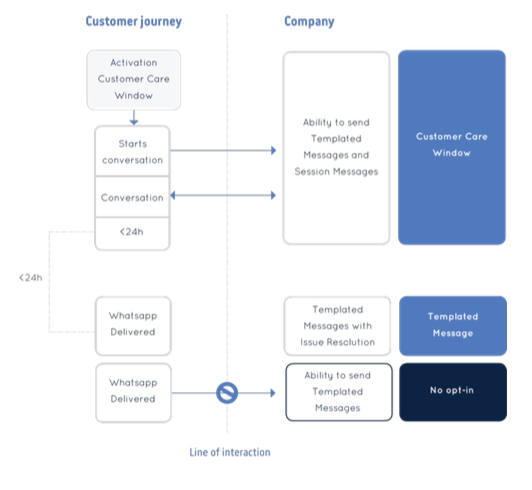 The Customer Care Window ends 24 hours after the last message is sent by the end-user. In this case, the company loses the ability to send messages to that specific end-user and only Templated Messages for which an opt-in has been granted can be sent.